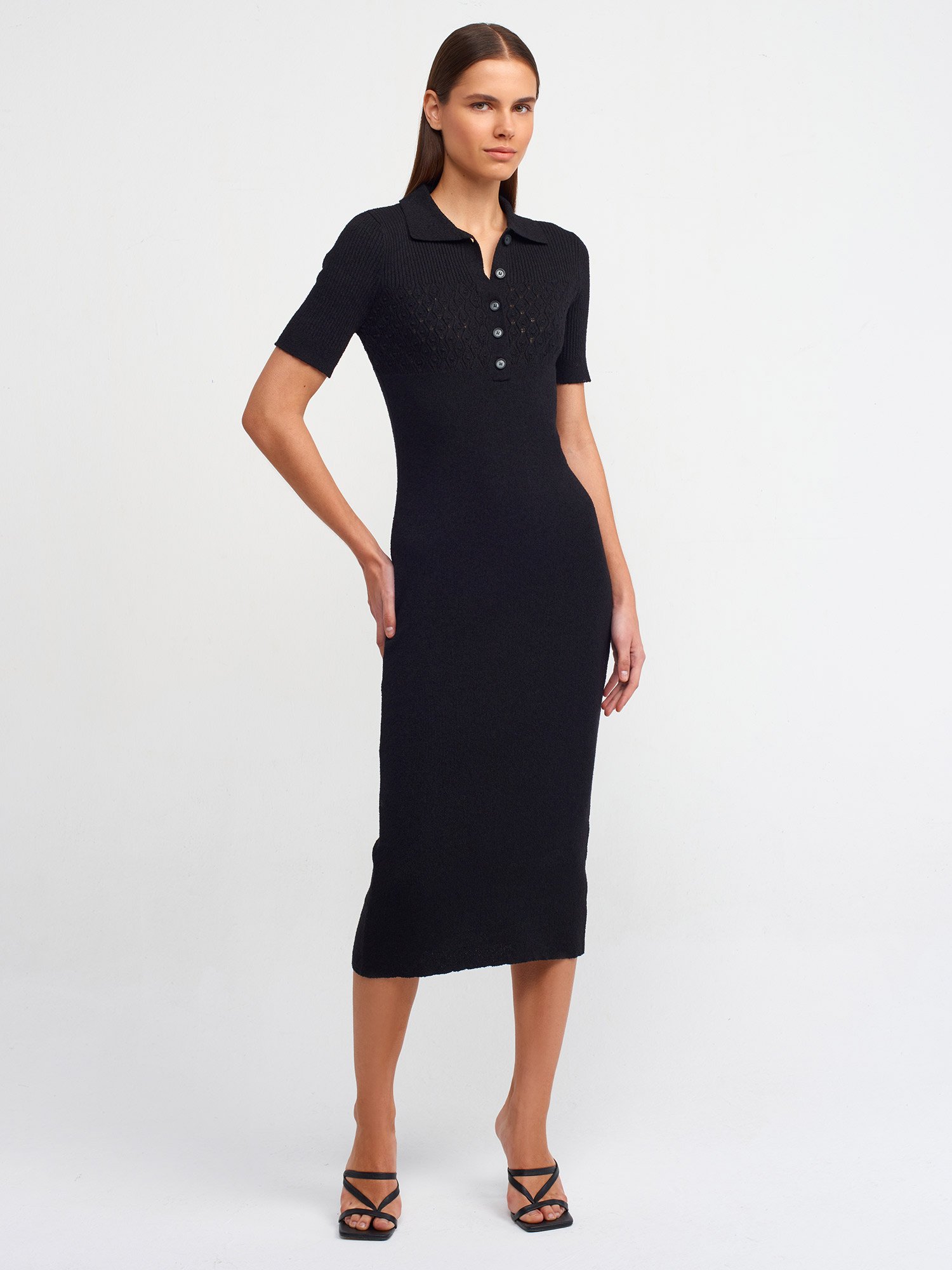 Siyah Polo Yaka Fırfırlı Triko Elbise